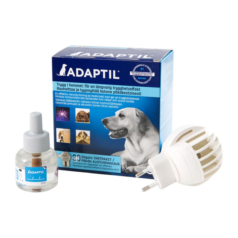 Käyttöaiheet: Adaptil haihdutin sisältää koiraa tyynnyttävää feromonia, joka on luonnollinen, helppo ja ainutlaatuinen tuki koiralle pelkoa ja ahdistusta aiheuttaviin tilanteisiin. Feromoni ennaltaehkäisee ja vähentää ei-toivottua käyttäytymistä mm. stressaavissa tilanteissa (ilotulitus, kovat äänet, yksinolo kotona), sopeutumisessa uuteen ympäristöön (uusi koti, muutto, uusi perheenjäsen tai lemmikki).