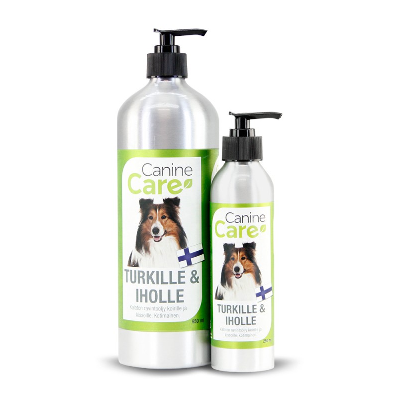 CanineCare Turkille & iholle valmistetaan Suomessa elintarvikelaatuisista raaka-aineista. Se soveltuu kaikille koirille ja kissoille ikään katsomatta. Raikas öljy on helppo annostella kätevästä pumppupullosta lemmikin ruoka-annoksen joukkoon. CanineCare Turkille & iholle on täysin kasvipohjainen - se ei sisällä kalaöljyä.