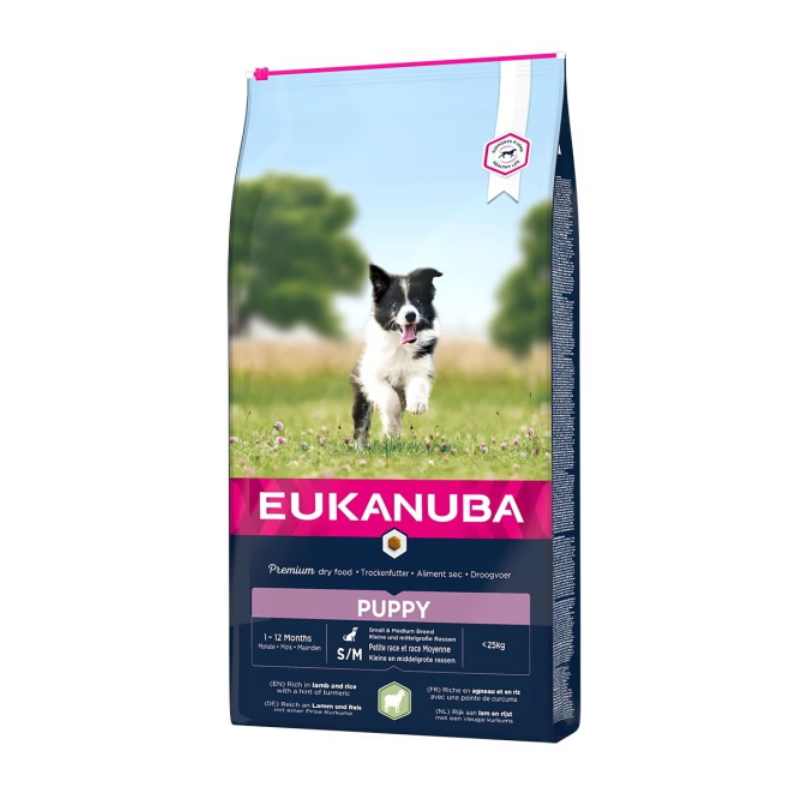 Eukanuba Puppy & Junior Small & Medium Breed Lamb & Rice on penturuoka 1-12 kuukauden ikäisille, alle 25 kg kokoisiksi kasvaville koirille.