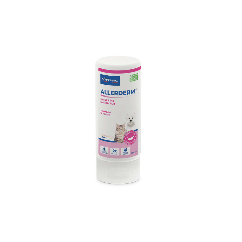 Allerderm shampoo -sensitive skin ( ent Epi-Soothe) on rauhoittava kaurajauhoa sisältävä shampoo koirien ja kissojen sekä koiran- ja kissanpentujen peruspesuun. Allerderm shampoo -sensitive skin sopii erityisesti herkälle ja kuivalle iholle sekä ärtyneelle ja kutisevalle iholle. Se auttaa myös neutraloimaan pahaa hajua ja kosteuttamaan ihoa. Hedelmäinen tuoksu.
