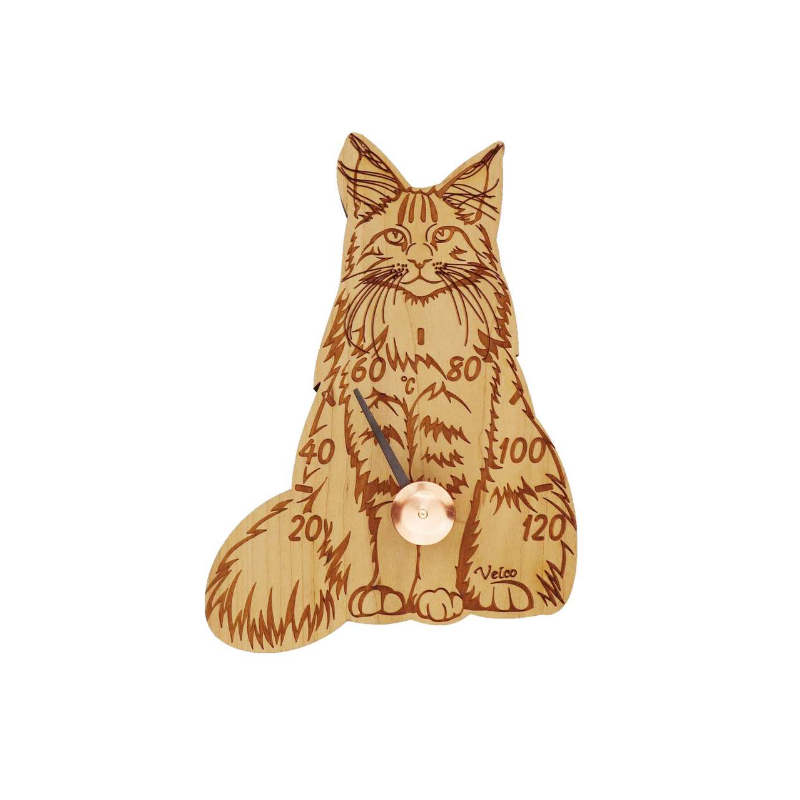 Kissa-aiheinen saunamittari, lämpökäsiteltyä koivua.