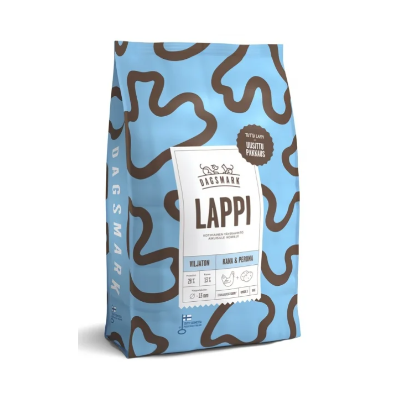 LAPPI-koiranruoka valmistetaan kotimaisista, hyvin sulavista ja luonnollisista raaka-aineista. Se sisältää mm. kanaa, perunaa ja pellavaa sekä kaikki koiran tarvitsemat vitamiinit ja kivennäisaineet. Täysravinto on vehnätön ja soijaton ilman säilöntä-, aromi- ja väriaineita. Dagsmark-tuotteilla on Avainlippu.