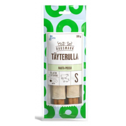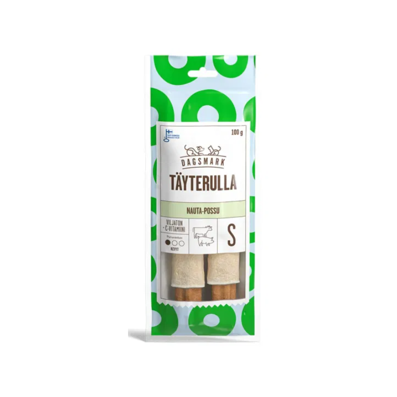Dagsmark Täyterulla nauta-possu on kotimaista laatua parhaimmillaan! Tämä pienikokoinen pururulla on valmistettu aidosta naudannahasta ja täytetty herkullisella Mellilässä tuotetulla possu-mustikkatäytteellä. Täyte sisältää luonnollista kollageenia ja C-vitamiinia, jotka tukevat koiran ihoa, turkkia ja nivelten hyvinvointia. Rullan rakenne on suunniteltu sopivaksi myös koirille, joilla on heikompi puruvoima.