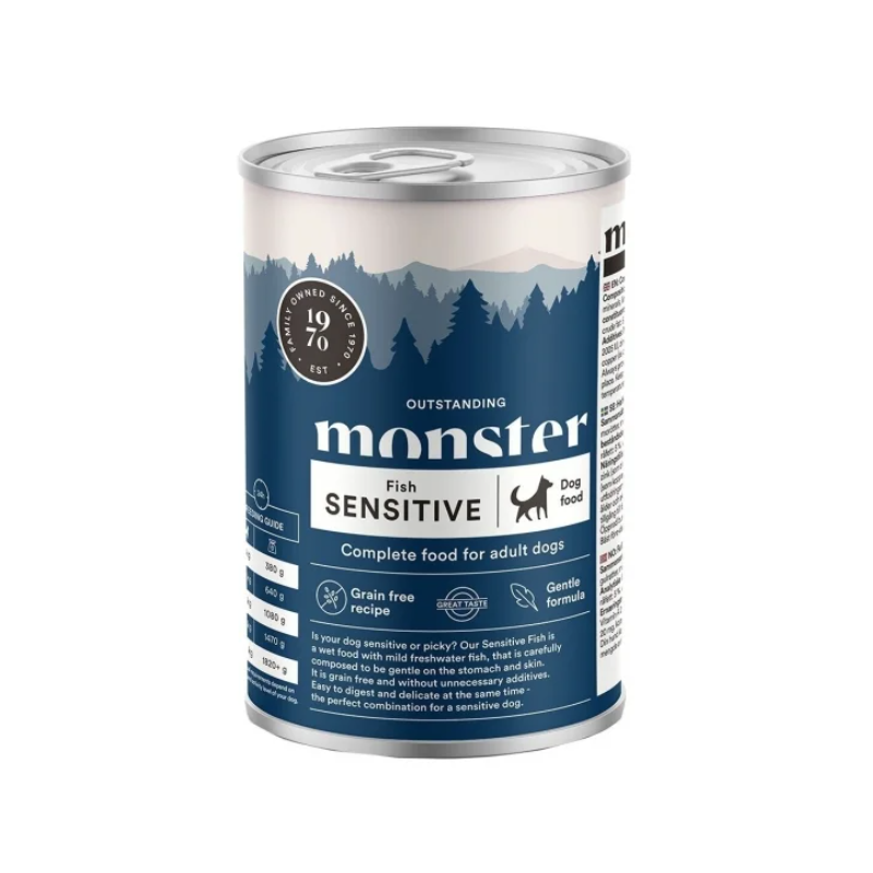 Monster Dog Sensitive Fish on märkäruoka herkkävatsaiselle koiralle. Koiran viljaton märkäruoka laadukkaista raaka-aineista on hellävaraista myös ihon terveydelle. Hyvin sulava Monster-märkäruoka koiralle ei sisällä mitään turhaa. Täysravinto sisältää ainoana proteiininlähteenä miedon makuista makean veden kalaa – hellävaraista ja herkullista! Tarjoa sellaisenaan tai kuivaruoan kanssa.