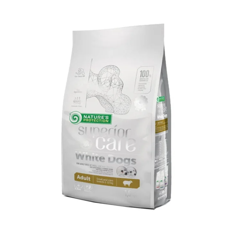 Nature's Protection Superior Care White Lamb Small & Mini on pienikokoisen valkoisen koiran ruoka vähentämään ruskeita värjäytymiä silmien alla, suupielissä ja tassuissa.