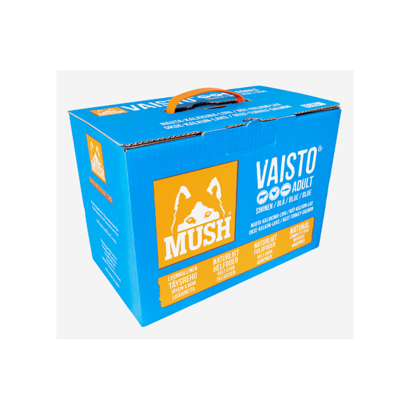 MUSH Vaisto® sininen Nauta-lohi-kalkkuna-ateria on täysrehu koiran BARF-ruokintaan. 10kg säästöpakkaus tulee kätevässä kantokahvallisessa laatikossa.
