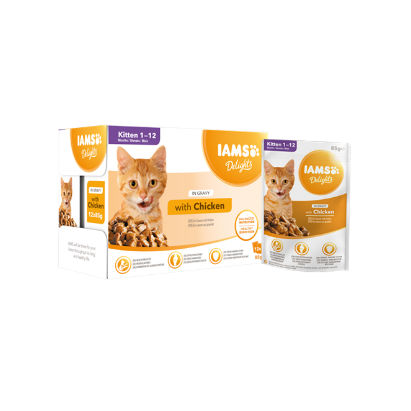 IAMS Delights -sarjan kanaa kastikkeessa -ravinto on täydellistä ja tasapainoista märkäruokaa kissanpennuille. Jokainen resepti valmistetaan huolella laadukkaista ainesosista ja se tarjoaa kissallesi vastustamattomia makuelämyksiä. IAMS Delights tarjoaa tärkeitä ravitsemuksellisia etuja kissasi elämän jokaiseen vaiheeseen.