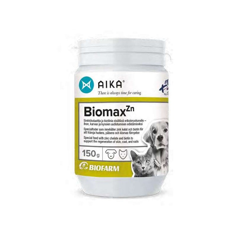 AIKA Biomax Zn on täydennysrehu koirille ja kissoille tukemaan ihon, karvan ja kynsien uusiutumista. Sopii erityisesti tilanteisiin, joissa lemmikillä esiintyy epänormaalia karvanlähtöä, turkin kiillottomuutta, ihon hilseilyä, lohkeilevia kynsiä tai halkeilevia anturoita. AIKA BiomaxZn valmisteen hivenaineet ovat hyvin imeytyvässä kelaattimuodossa.