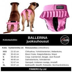 Ballerina-juoksuhousut ovat narttukoiran juoksuajan "pelastus", jotka suojaavat kodin pintoja ja sisustustekstiileitä juoksuajan tahroilta niin kotona kuin kyläillessäkin. Juoksuhousut sopivat myös virtsankarkailun avuksi esim. leikatuilla tai vanhemmilla nartuilla.